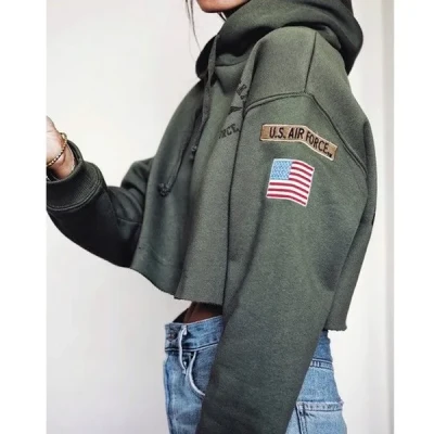 New Fashion Women Autumn Tops Casual Cotton Sweatshirts Armygreen Girls Sexy Long Sleeve Cropped Hoodie Airforce Print Drwastring Hooded Casual Loose Hoodie Coat
